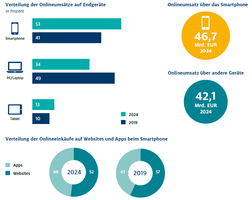 Mobile Endgeräte sind beim Onlineshopping weiterhin deutlich vorne. 66 Prozent der Onlineumsätze entfallen auf Smartphones und Tablets. Dabei wird nahezu die Hälfte der Onlinekäufe über Apps getätigt, die andere Hälfte über Websites. Mehr Informationen im HDE-Online-Monitor unter www.einzelhandel.de/online-monitor.